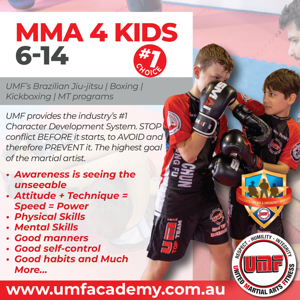 UMF MMA 4 Kids is more than just punching, kicking, elbows & knees. MMA alone DOES NOT develop character, having a structure towards self-respect (behaving dignified & honourably) is what we want for our MMA Kids.